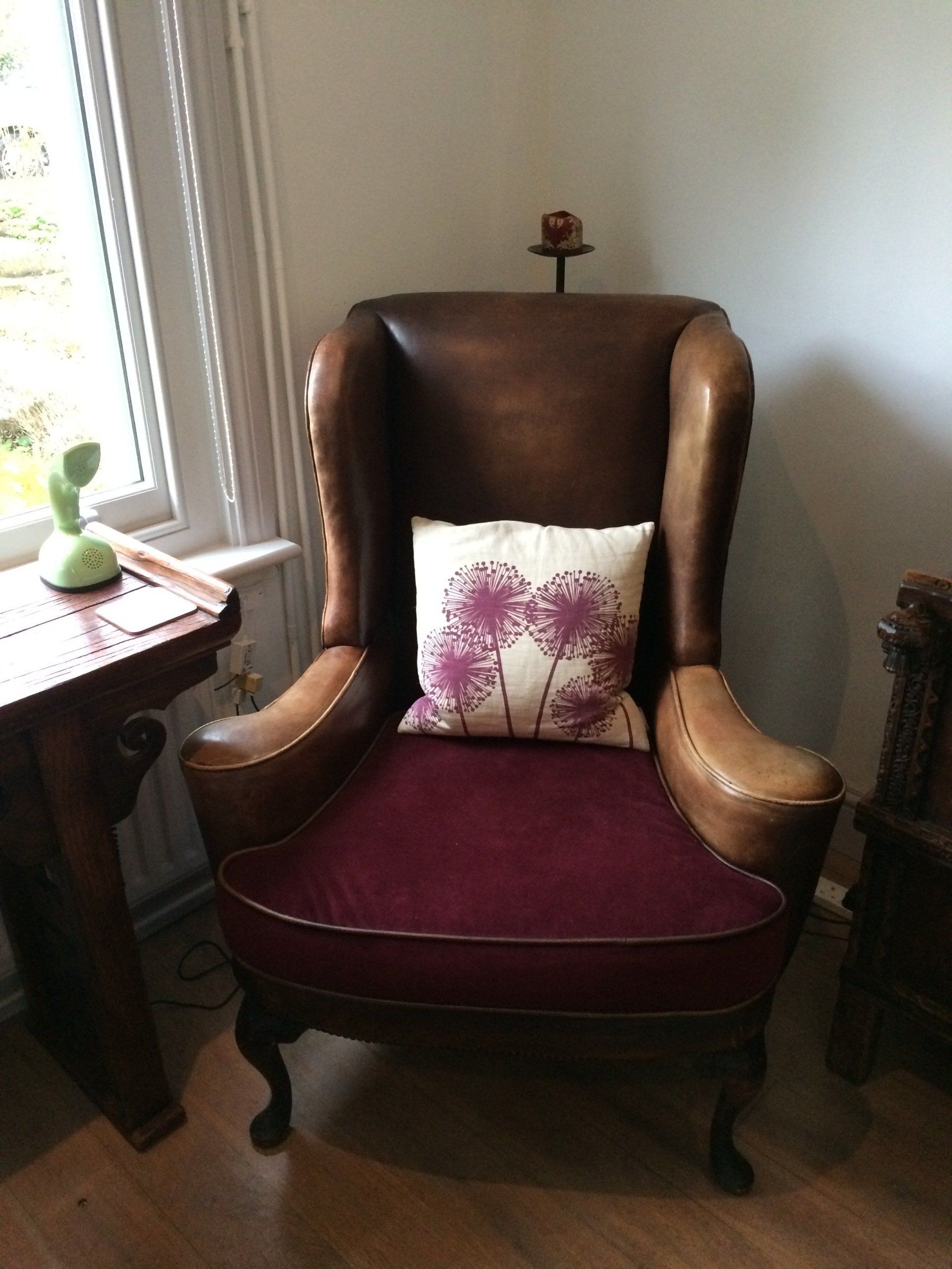 This chair had sentimental value to the client though it really needed dragging into the modern day to fit into her funky home. The pink fabric was incredibly expensive so I only bought a metre. The rest of the fabric was recycled curtains and old jeans. The back is deep buttoned but I left them slightly raised so you could see the contrasting colours more.