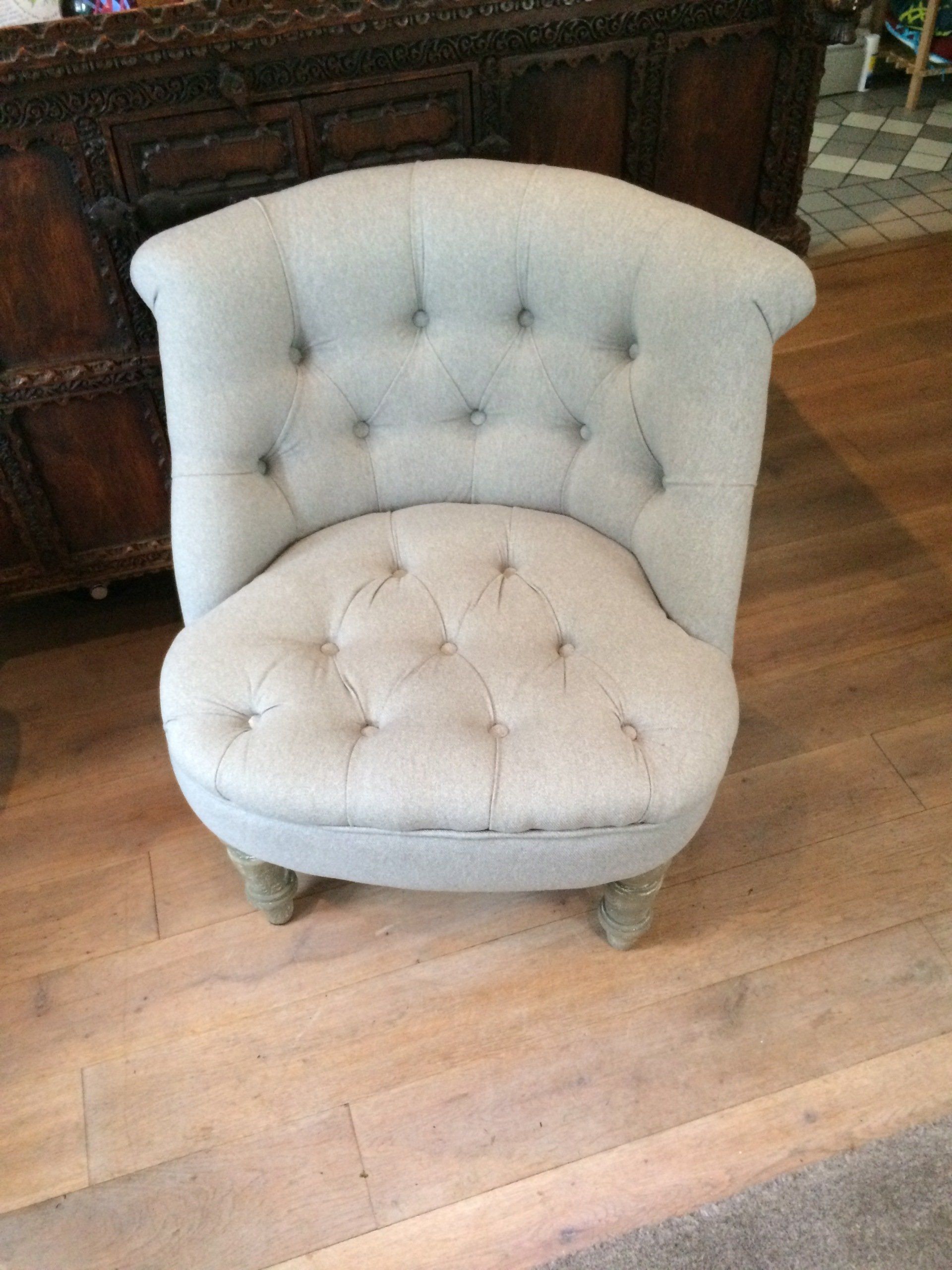 This chair had a total overhaul covered in vintage gray linen.