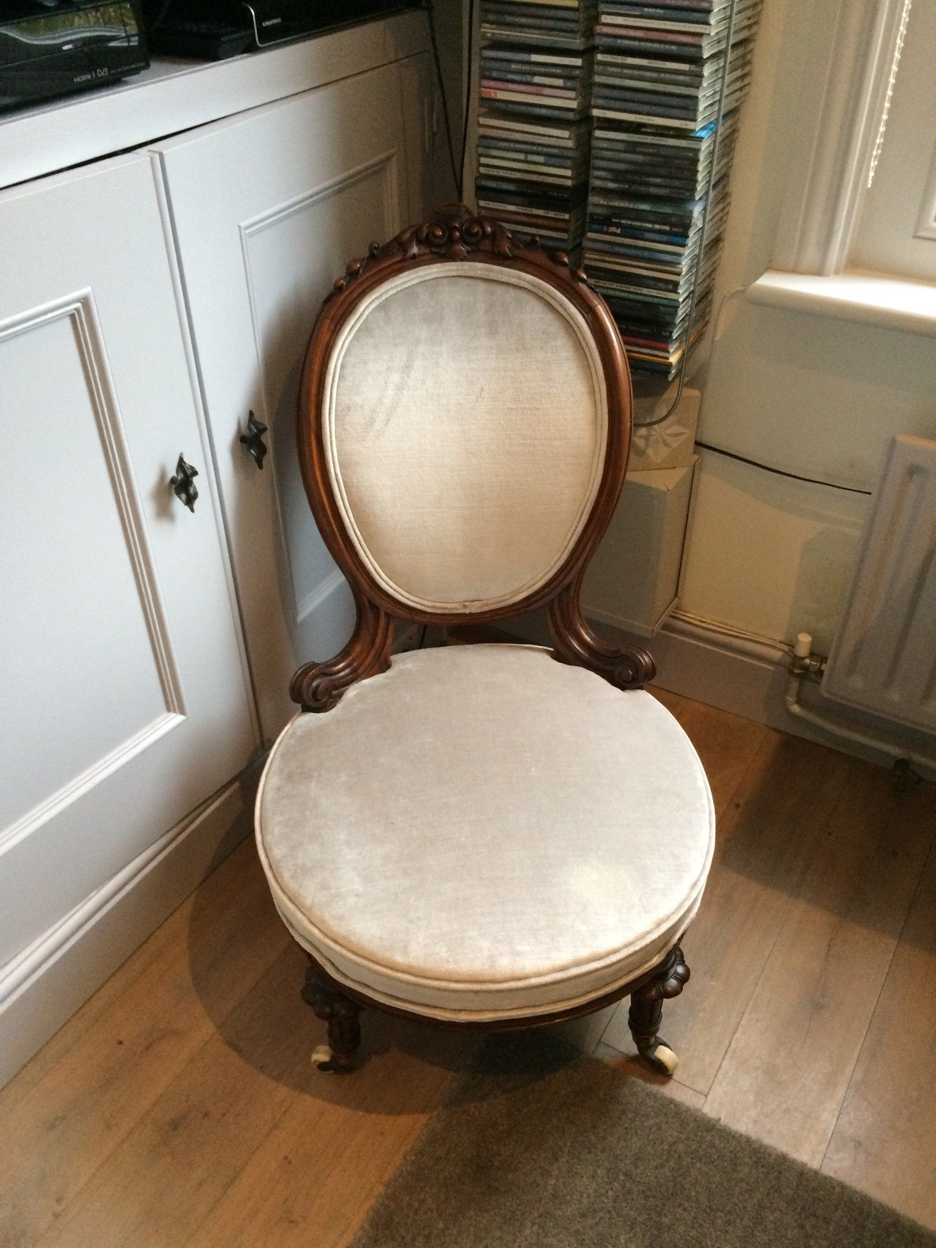 This little chair was quite revolting. Its inards had sort of dissolved and it stank! But its springs were all sound so I completely replaced all the stuffing and covered it in bute tweed, java.